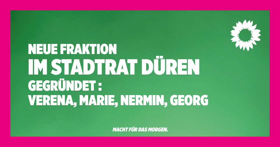 Die 4 über die Liste von Bündnis 90/Die Grünen in den Rat der Stadt Düren gewählten Mitglieder haben für die neue Ratsperiode eine Fraktion gebildet und starten mit der Arbeit. Als kurzes Update die wichtigsten Infos. Unten findet ihr das neueste Video aus den Sozial Media Kanälen.